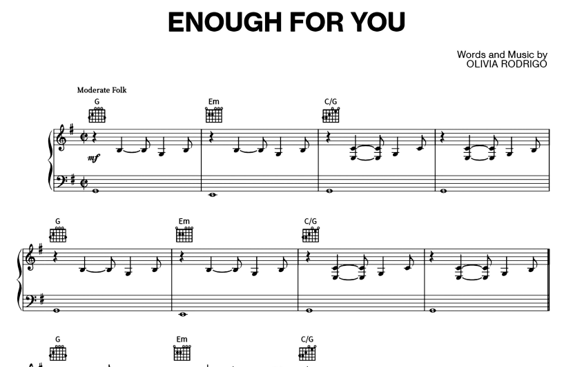 Hello music lovers, today I am sharing the piano notes of the song Olivia Rodrigo-Enough For You. You can use the download links below to download Olivia Rodrigo-Enough For You PDF scores.