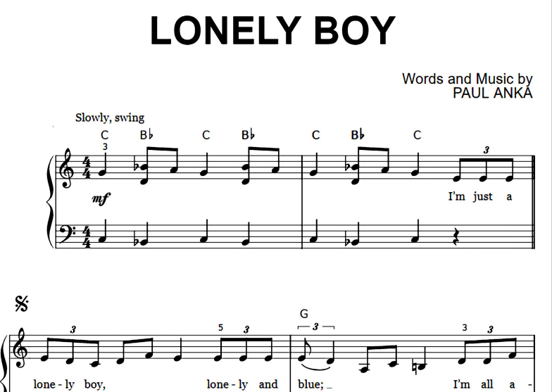 Hello music lovers, today I am sharing the piano notes of the song Paul Anka-Lonely Boy. You can use the download links below to download Paul Anka-Lonely Boy PDF scores.