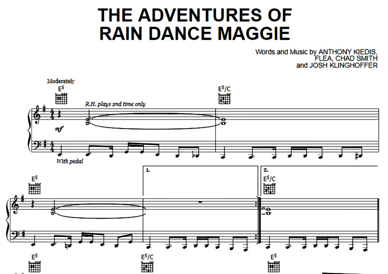 ello music lovers, today I am sharing the piano notes of the song Red Hot Chili Peppers-The Adventures Of Rain Dance Maggie. You can use the download links below to download Red Hot Chili Peppers-The Adventures Of Rain Dance Maggie PDF scores.