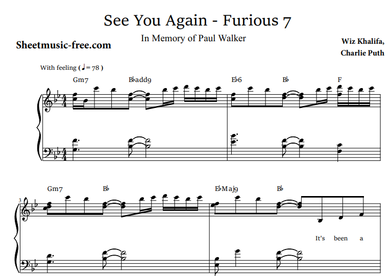 Hello music lovers, today I am sharing the piano notes of the song Wiz Khalifa-See You Again Furious. You can use the download links below to download Wiz Khalifa-See You Again Furious PDF scores.